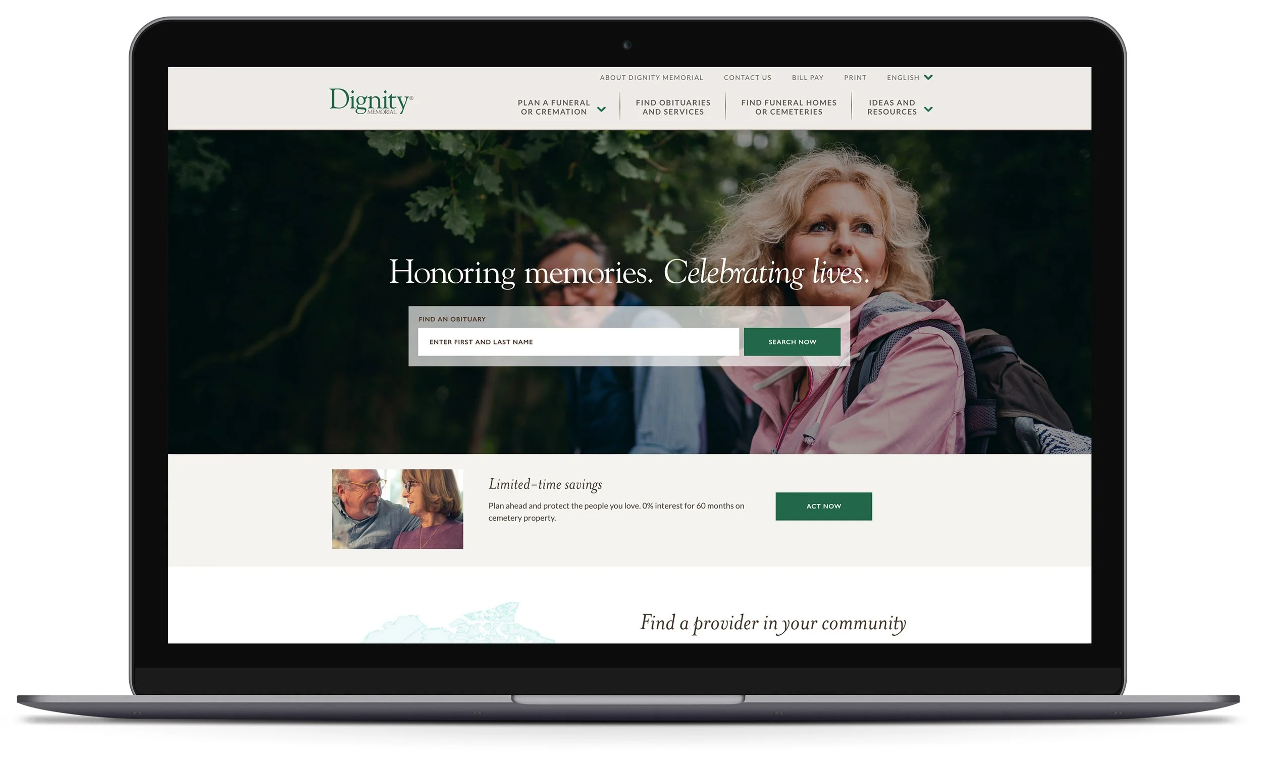 Dignity Memorial faced the challenge of engaging families in an essential but often avoided conversation about funeral planning. The work began with mission, vision, values, and culture, then extended into brand strategy, identity, and internal and external communications. By shifting the tone from somber to more human and celebratory, the brand opened the door to more honest engagement and reframed planning as an act of care.